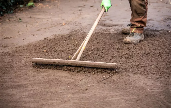 Den Boden gründlich auflockern, von groben Steinen, Moos und Unkraut befreien und mit dem Rechen für eine möglichst feinkrümelige Oberfläche sorgen.