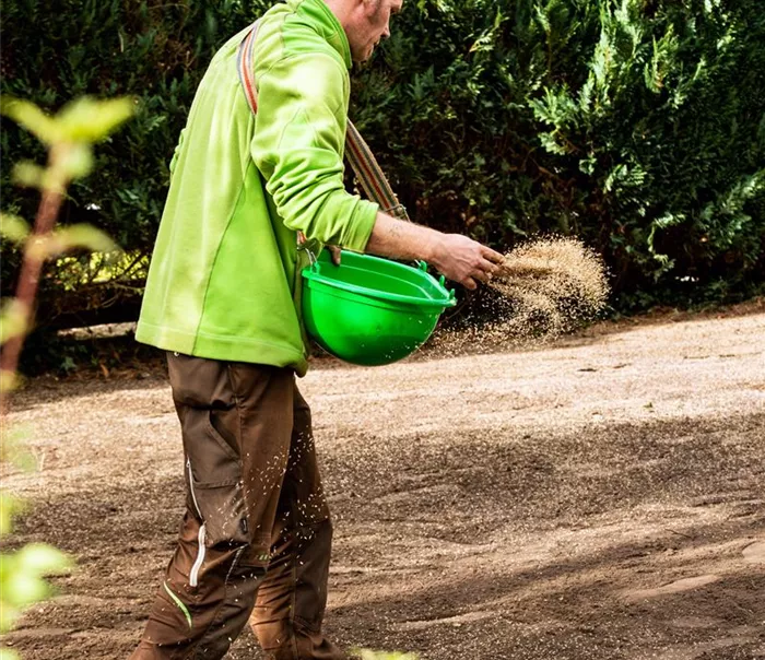 Anschließend das Saatgut im Kreuz- und Quergang möglichst gleichmäßig verteilen. Dies kann per Hand oder mit einem Handstreuer durchgeführt werden. Die besten Ergebnisse, insbesondere bei großen Flächen, erzielen Sie mit einem Streuwagen.